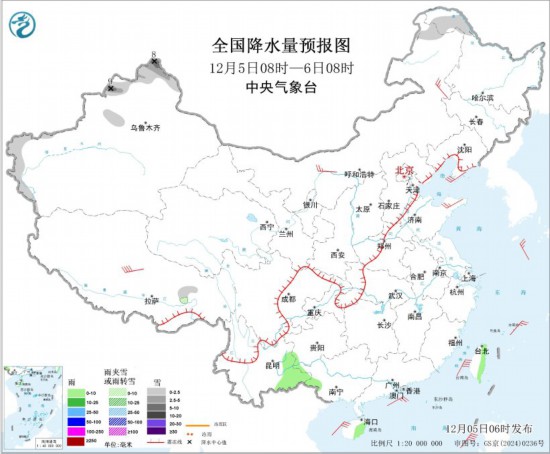 全国降水预报图(12月5日8:00至12月6日8:00)
