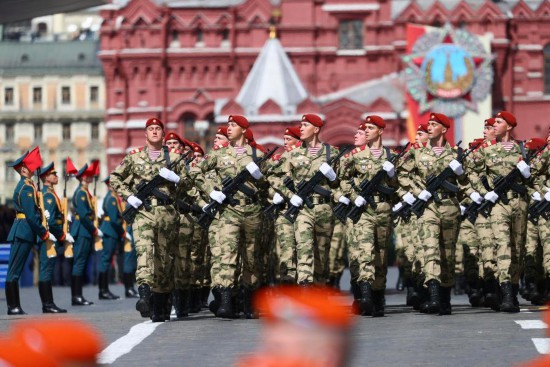 5月9日,俄罗斯士兵参加在首都莫斯科举行的纪念苏联卫国战争胜利80周年阅兵式。新华社记者白雪琪 供图。